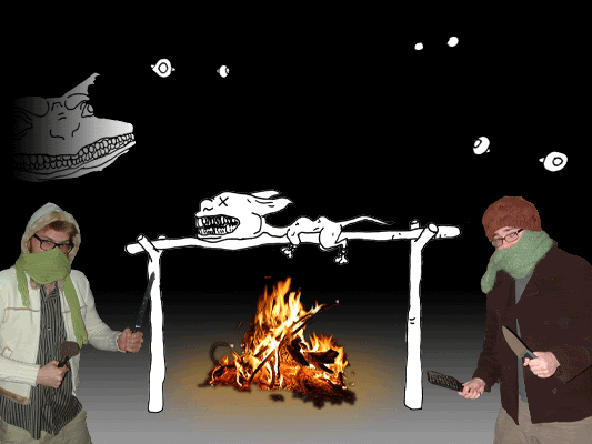 Alex: Most people prefer steamed Clammals, but here we are enjoying a nice spit-roasted one. Catching a Snow Clammal is difficult to do, but well worth the effort. This young one fed us for three days. And it was delicious!